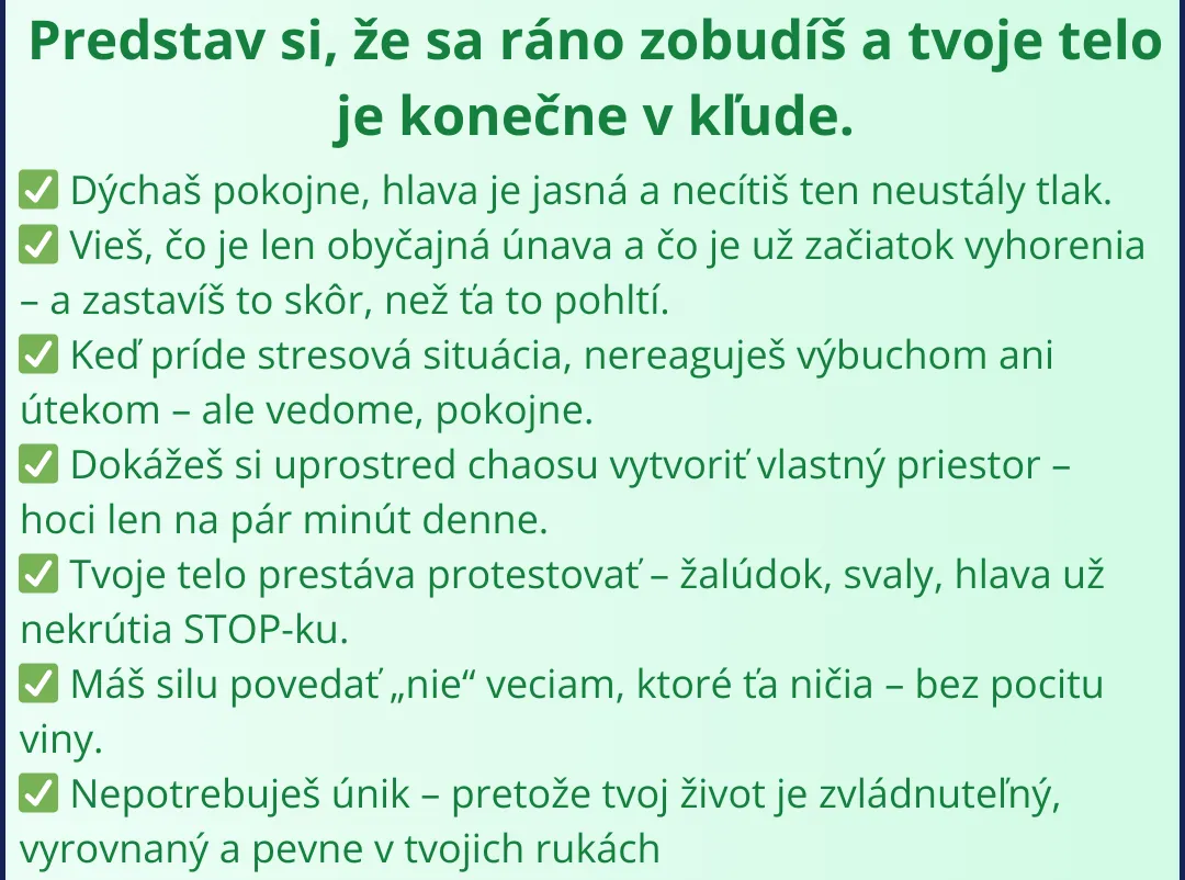 🌱 Krok 3 – Aktivácia pokoja: krátka vizualizácia, ktorá ti „prepne“ myseľ do stavu kľudu a sústredenia.